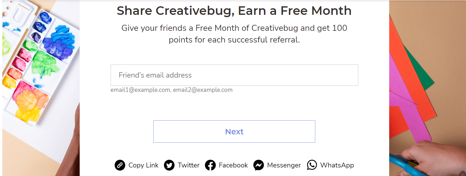 Refer your friends to give them a free month of Creativebug. Each successful referral gives you 100 points.