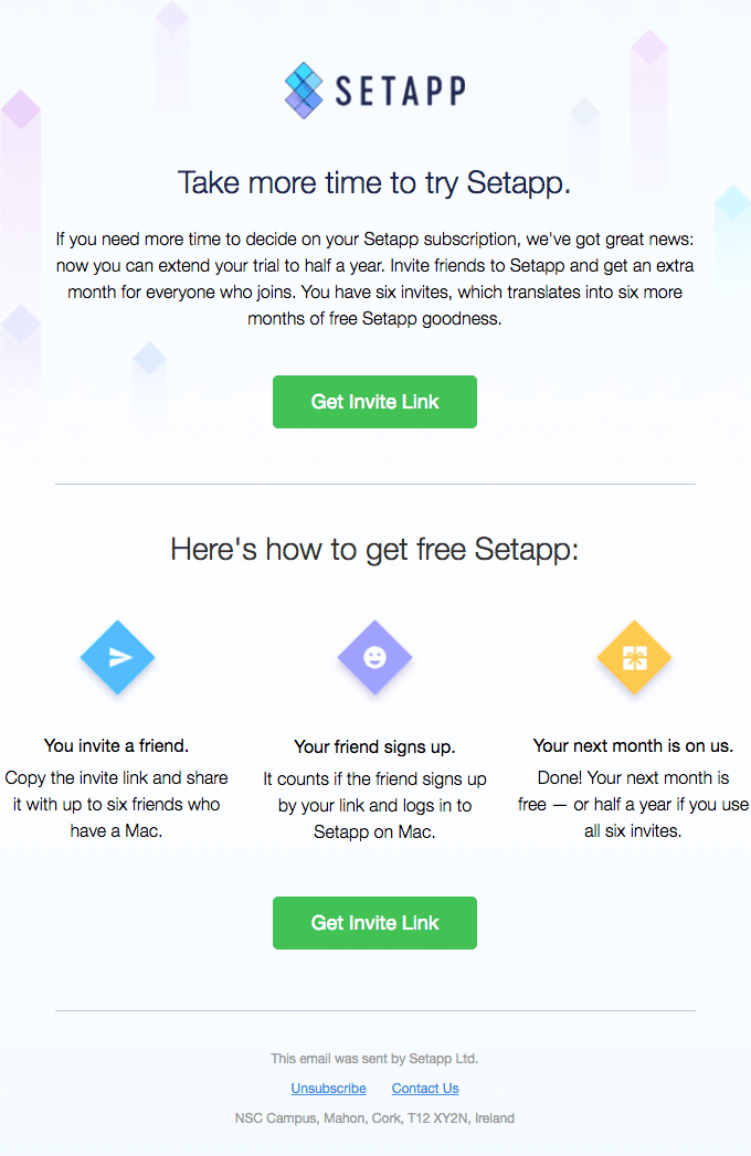 Here we can see an example of an email sent by Setapp, a subscription service for iOS and macOS apps.