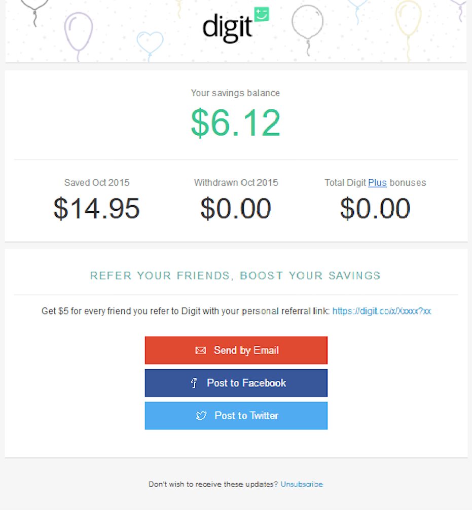 The email features an account update, where customers can see how much money the app has helped them save, which can motivate them to keep using the app.