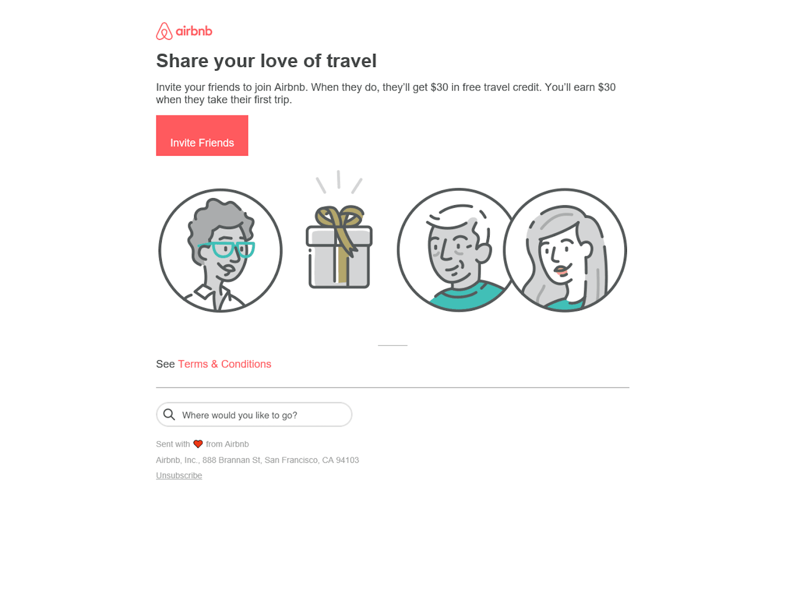 It's a simple reward system where the referrer earns $30 when the referee makes their first trip. The email informs the customer that it's a two-sided program where their friend also receives a reward ($30 in free travel credit).