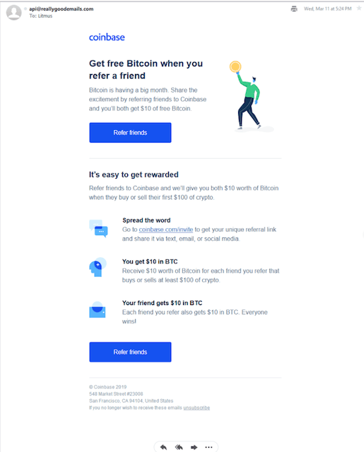 The headline really catches your attention. For every referral, Coinbase will give customers a free coin. That seems like a great opportunity customers wouldn't want to miss.