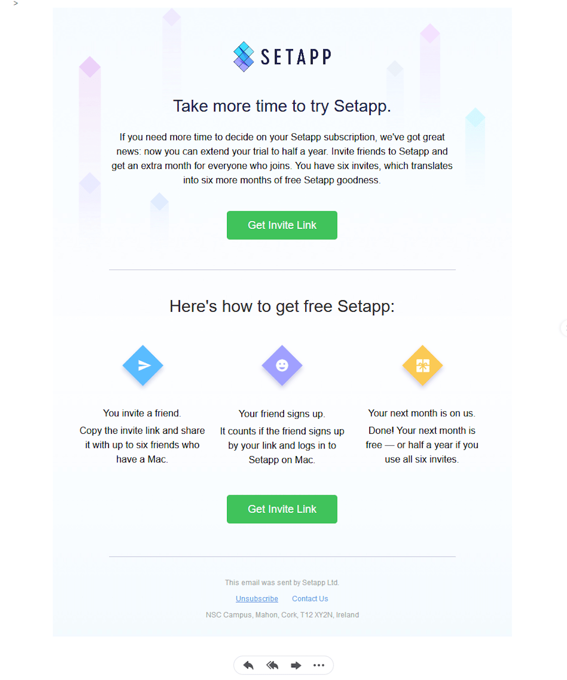 A fantastic thing about this email is the timing. The company smartly sends the email to the customer while they're in the middle of their trial period. By simply referring their friends to Setapp, the referrer can extend their free trial to half a year.