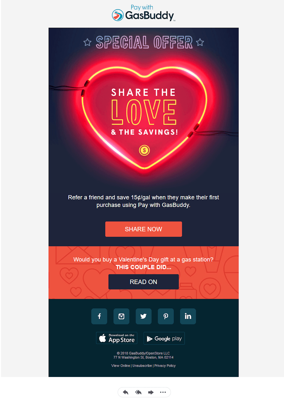 The email catches the eye with a playful GIF that features a neon heart light. Inside the heart, there's a catchy copy that reads, "share the love & the savings."