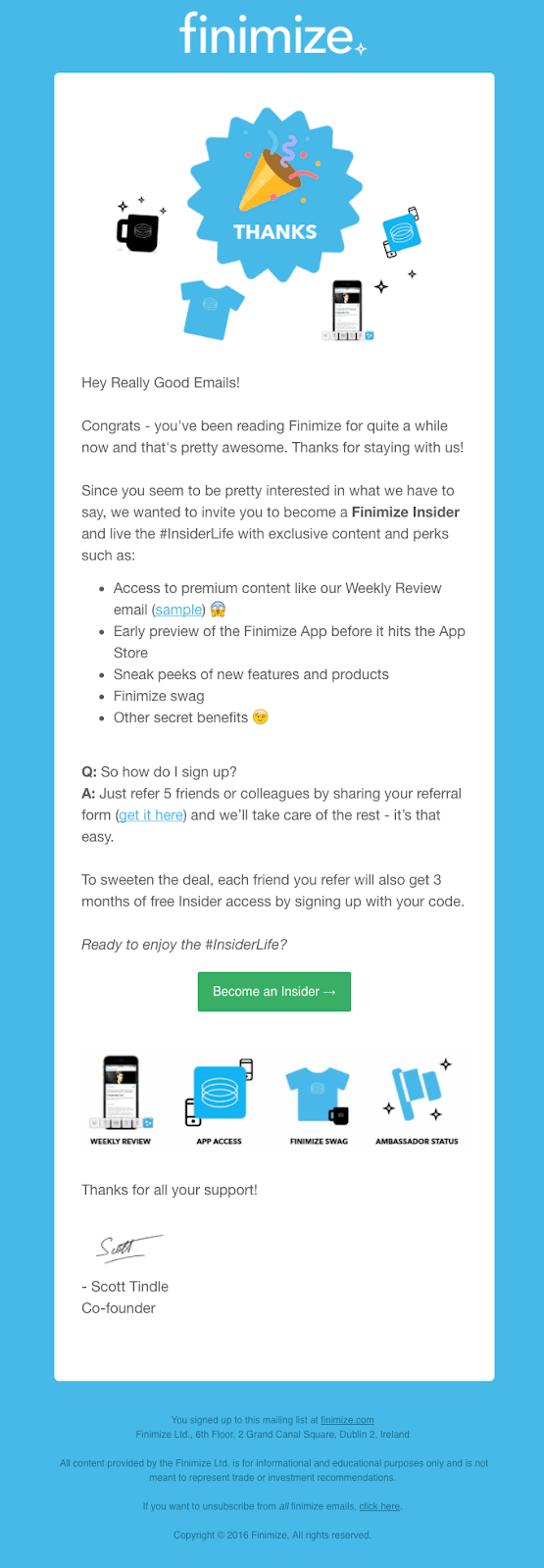 What's more, the email lists all the referral program incentives the reader can win by joining the program. Even better, there's a myriad of impressive rewards, from access to premium content to brand swag.